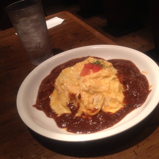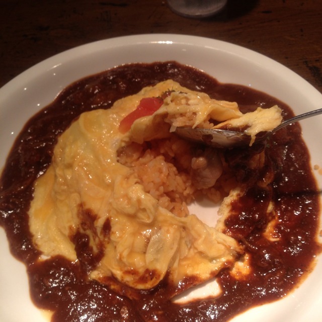 卵ふわふわで本当に嬉し美味しい。 ルーは渋みの中に甘みがある。 想像するに、トマトと生クリームがたっぷりと入っているに違いない。