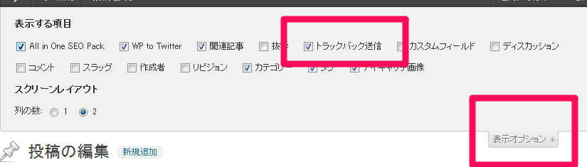 次に、WordPressの記事編集ページ上位にある[表示オプション]>[トラックバック送信]をクリックします。