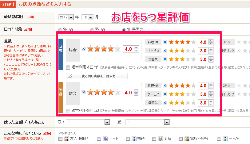 お店の評価を入力していきます。5段階評価です。