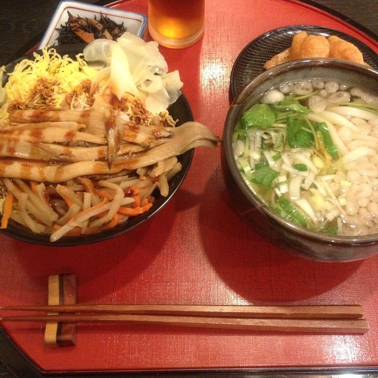 あなご丼の酢飯は甘く、うどんは塩気が強い。