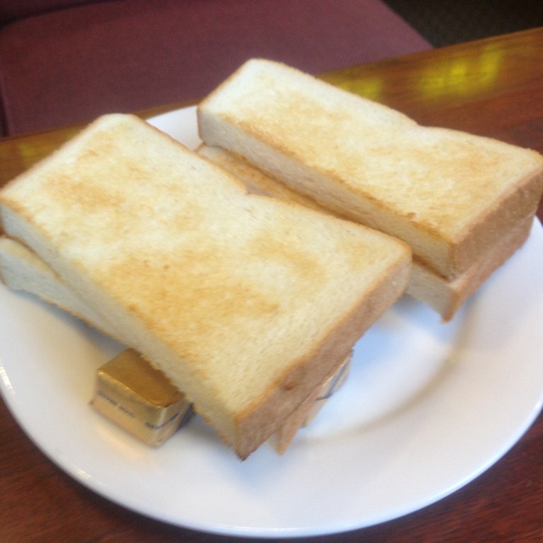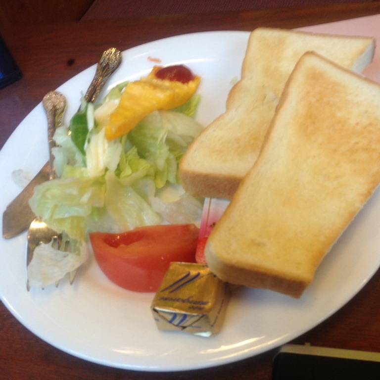 。モーニングセットのトーストセット。卵はヒエヒエだが、気にしない。 レタスには、ドレッシングではなくてマヨネーズがかかっているのが逆に斬新だったり。 トーストは焼きたてなのが嬉しい。