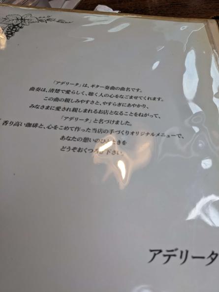 店内はBGMとしてやさしいバロック音楽が流れます. アデリータとはギター楽曲の曲名.